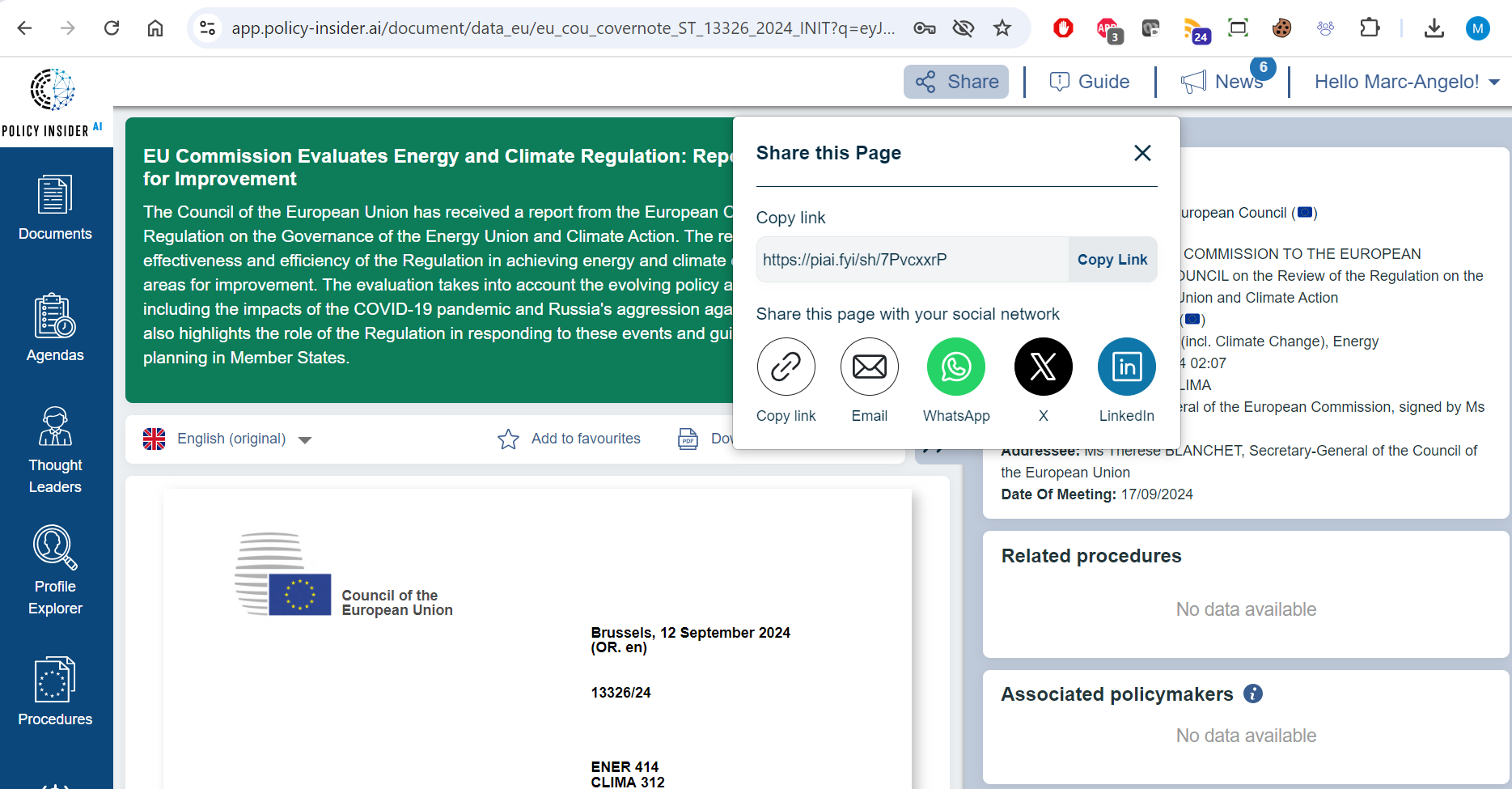 We are excited to introduce the latest update on welcome.policy-insider.ai/: our brand-new sharing function. Now, you can easily share a variety of content, including documents, procedures, profiles, and events, with just a click! As shown in the screenshot below, users can share content across multiple platforms like email, WhatsApp, LinkedIn, and more. Simply copy the link or use your favorite social network to distribute crucial policy information.